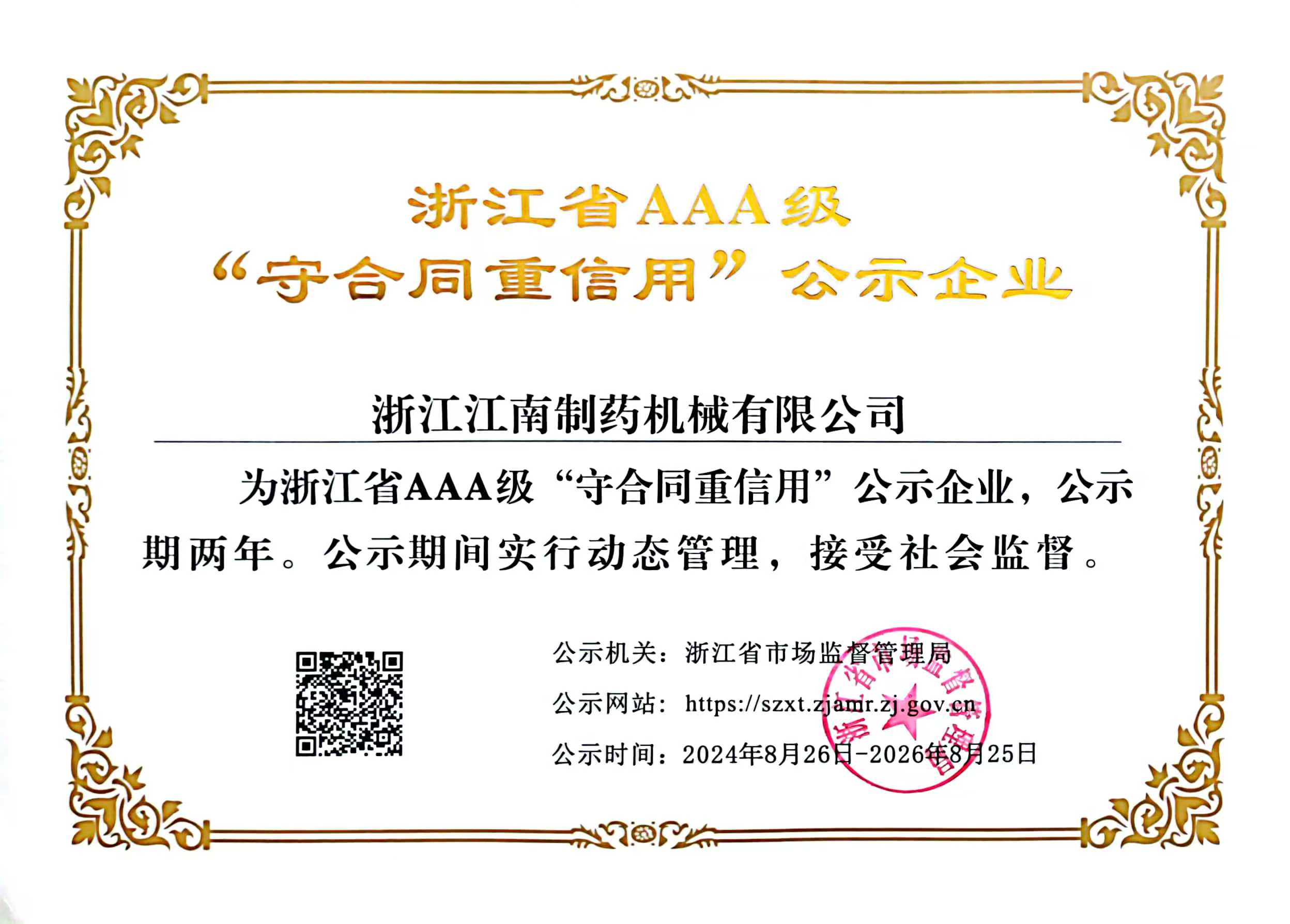 在此次发布的名单中,浙江江南制药机械有限公司榜上有名,入选2024 年浙江省 AAA 级守合同重信用企业名单。