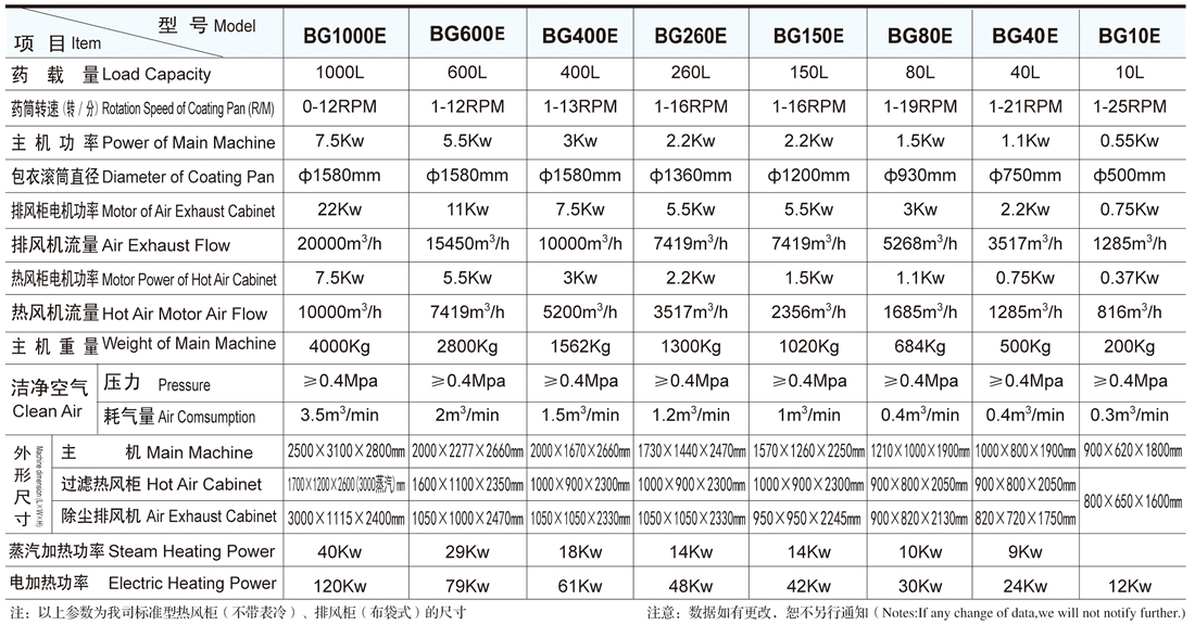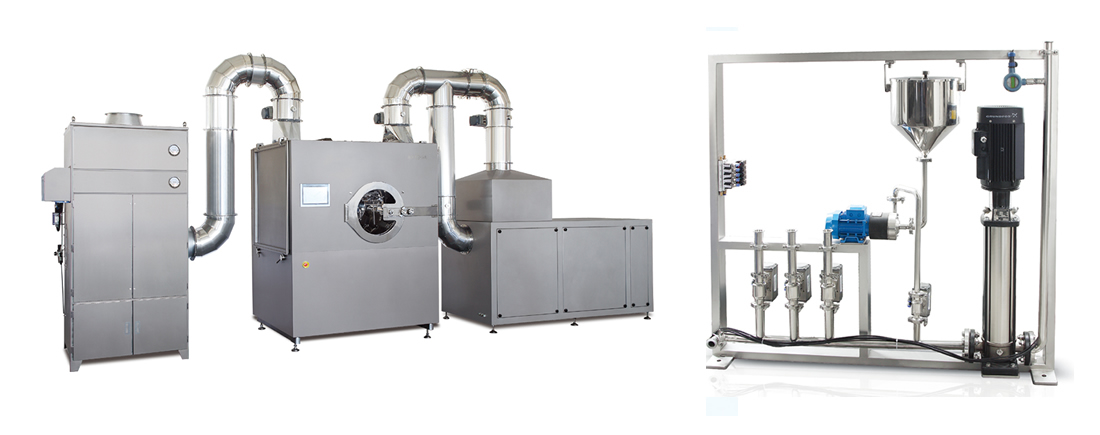 基本工作原理 : 片芯在包衣机洁净密闭的旋转滚筒内,不停地作复杂轨迹运动,翻转流畅,交换频繁,由恒温搅拌桶搅拌的包衣介质,经过泵的作用,从喷枪喷洒到片芯上,同时在热风和负压作用下,由热!风柜供给的10万级洁净热风穿过片芯,经由底部筛孔,再从风门排出,使包衣介质在片芯表面快速干燥,形成坚固、致密、光滑的表面薄膜、整个过程在PLC控制下自动完成。
